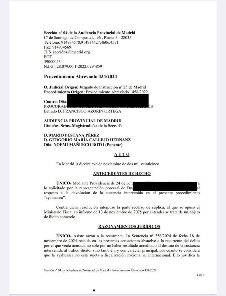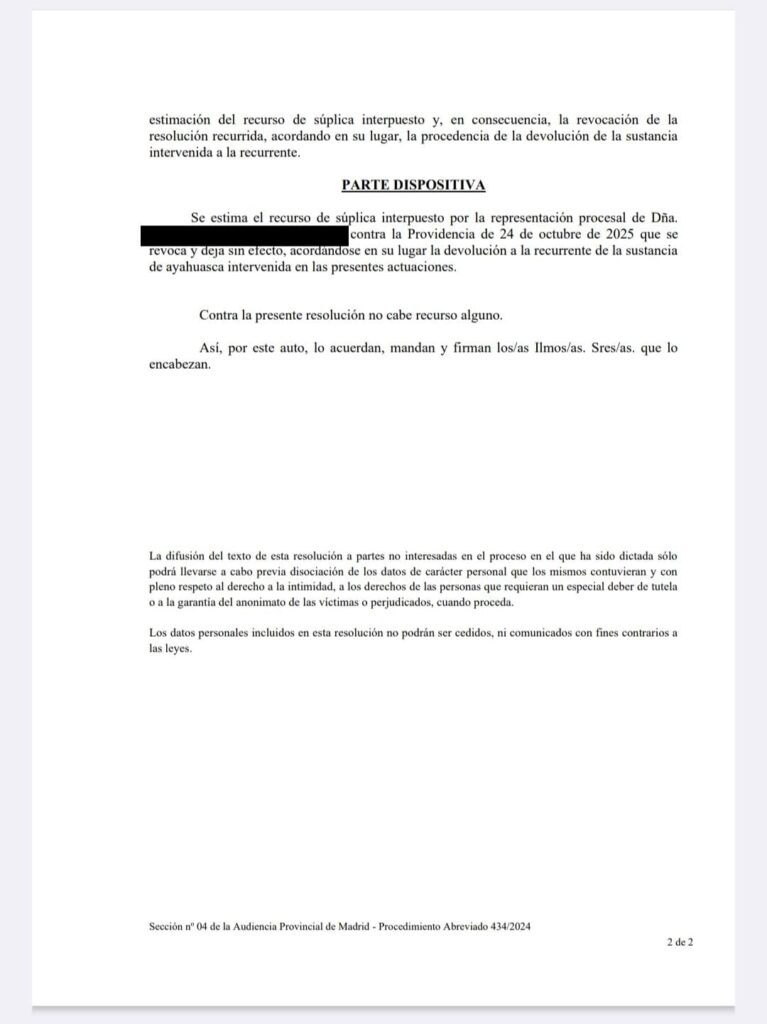 मैड्रिड के प्रांतीय न्यायालय द्वारा आयहुआस्का लौटाने के आदेश की प्रतिलिपियाँ, जिनमें स्पष्ट रूप से 'आयहुआस्का' शब्द अंकित है और मैड्रिड के विषविज्ञान संस्थान को इसे लौटाने का निर्देश दिया गया है, क्योंकि यह न तो अवैध है और न ही विषाक्त: